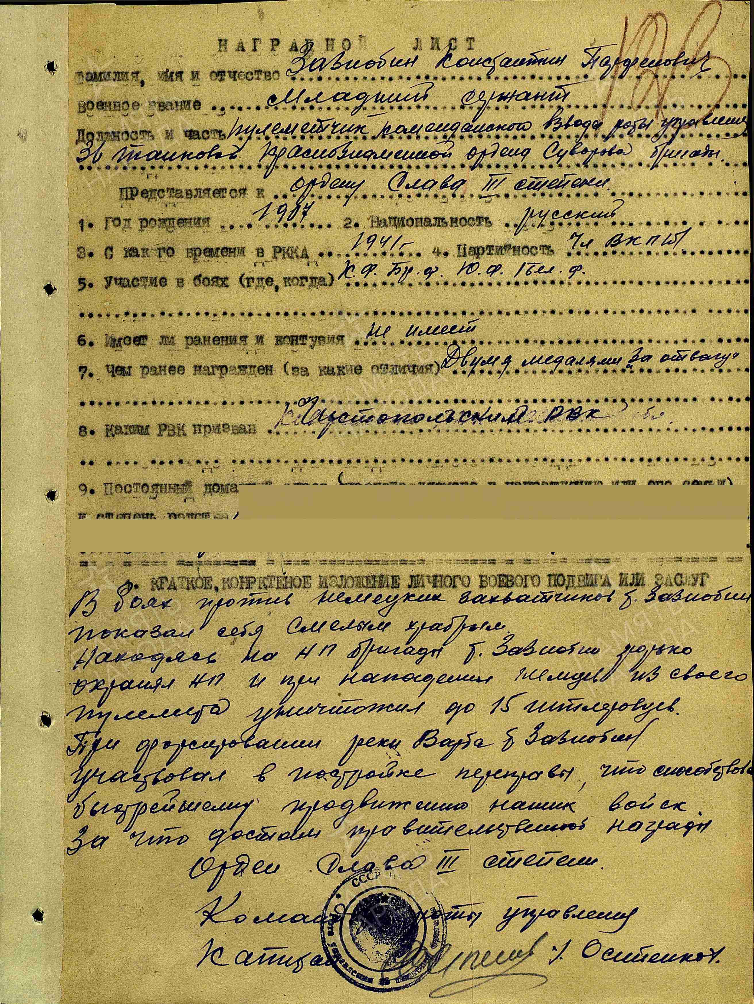 Константин Парфенович Зазнобин родился в 1907 г. Проживал в Чистопольском районе. В 1941 г. был призван в ряды Красной Армии Чистопольским районным военным комиссариатом. Служил в звании младшего сержанта в должности пулеметчика комендантского взвода роты управления 36 танковой Краснознаменной ордена Суворова бригады.