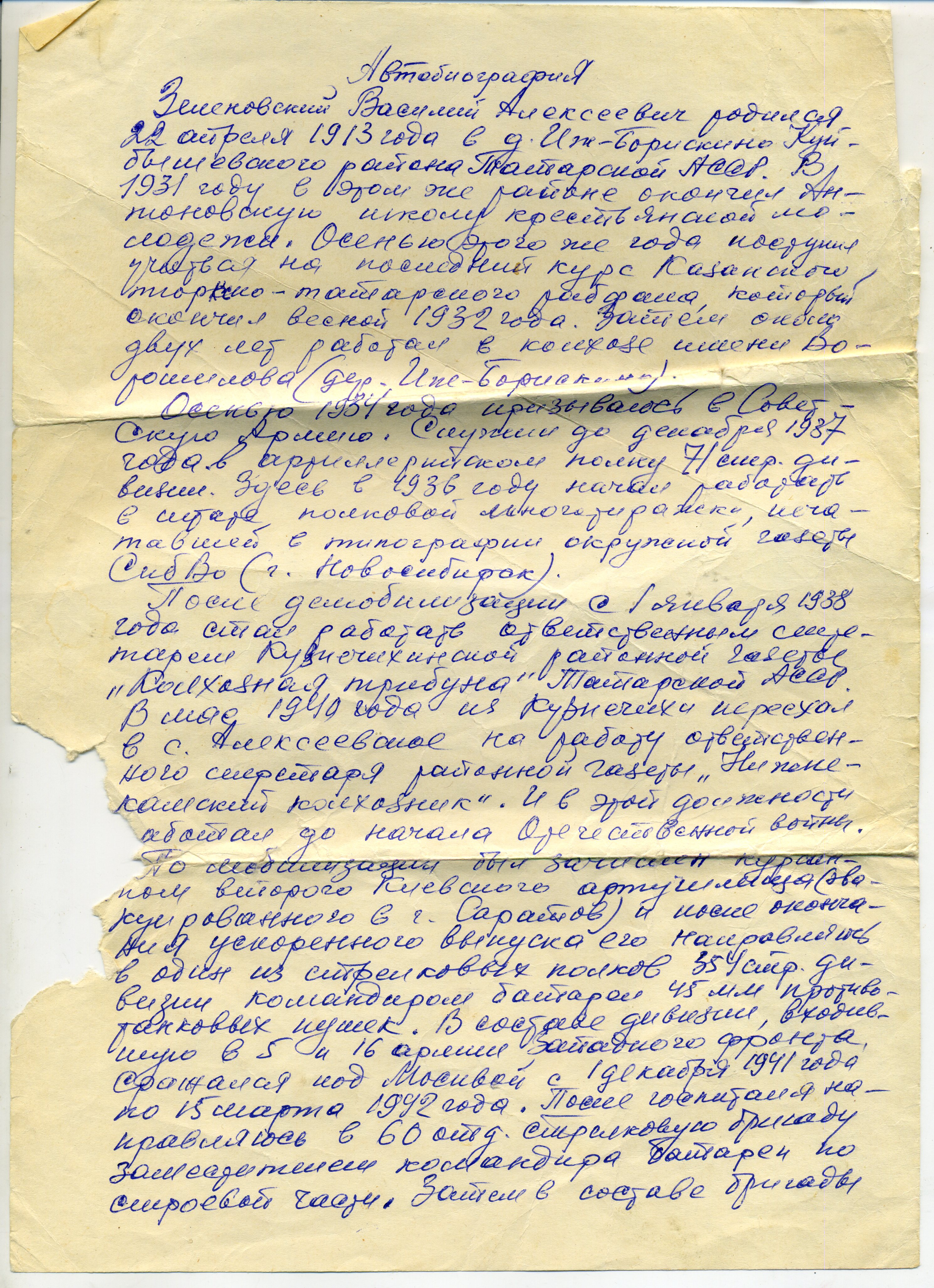ЗЕЛЕНОВСКИЙ Василий Алексеевич, 1913 (1912), д. Иж-Борискино. В 1934-1937 проходил срочную службу. Повторно мобилизован 26 июля 1941 Алексеевским РВК. Мл. лейтенант/ лейтенант, ком. огневого взвода истреб. противотанк. арт. батареи 1203 СП 354 СД 16 А Западного фронта, зам. ком. арт. батареи 60 отд. СБр 5 А Западного и 9 А Закавказского фронта. Участник обороны Москвы и Кавказа. Дважды ранен. После второго ранения служил в запасных частях. Демобилизован 15 фев. 1946. Награждён медалями «За оборону Москвы», «За оборону Кавказа».После войны работал редактором Алексеевской районной газеты «Заря».