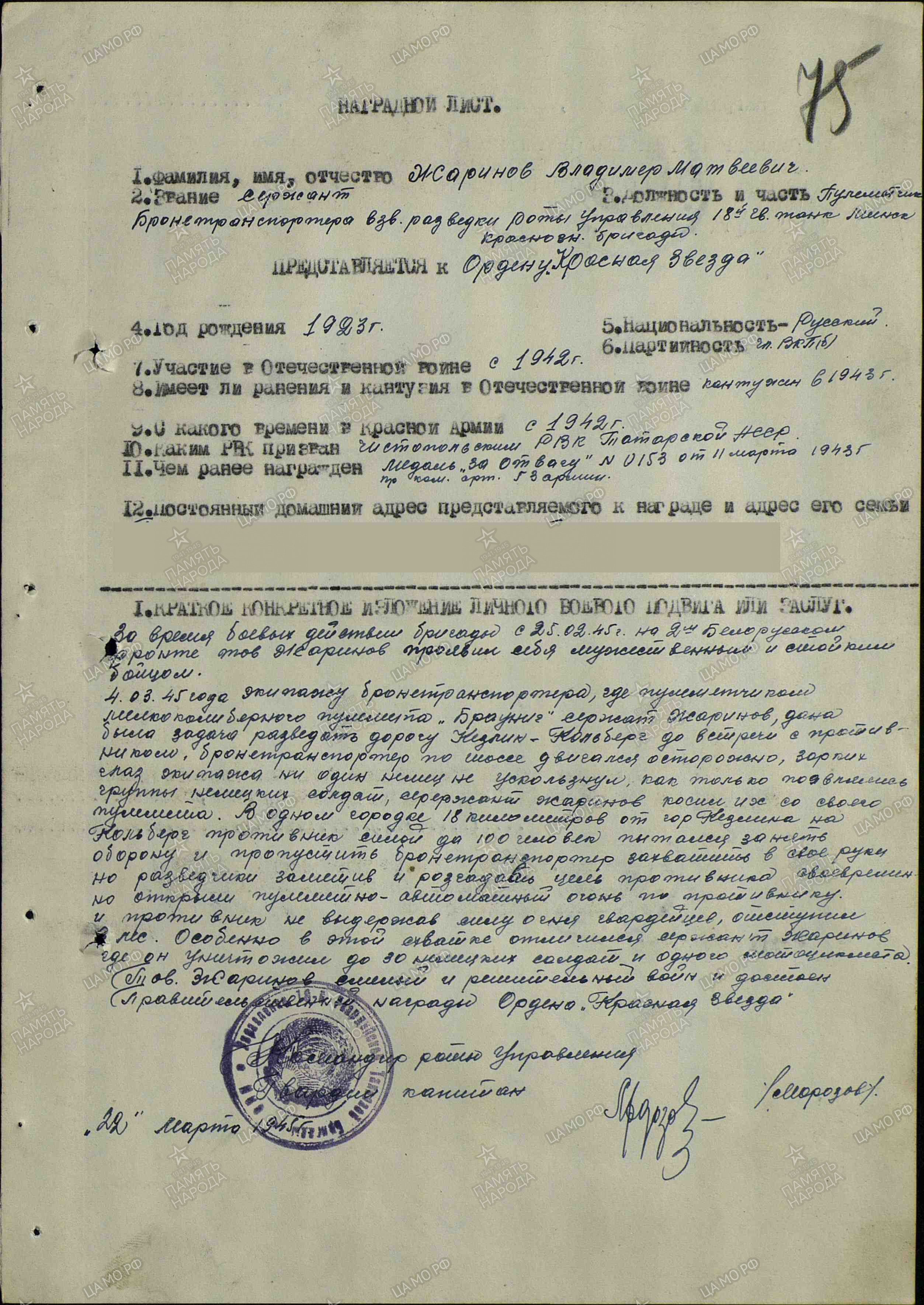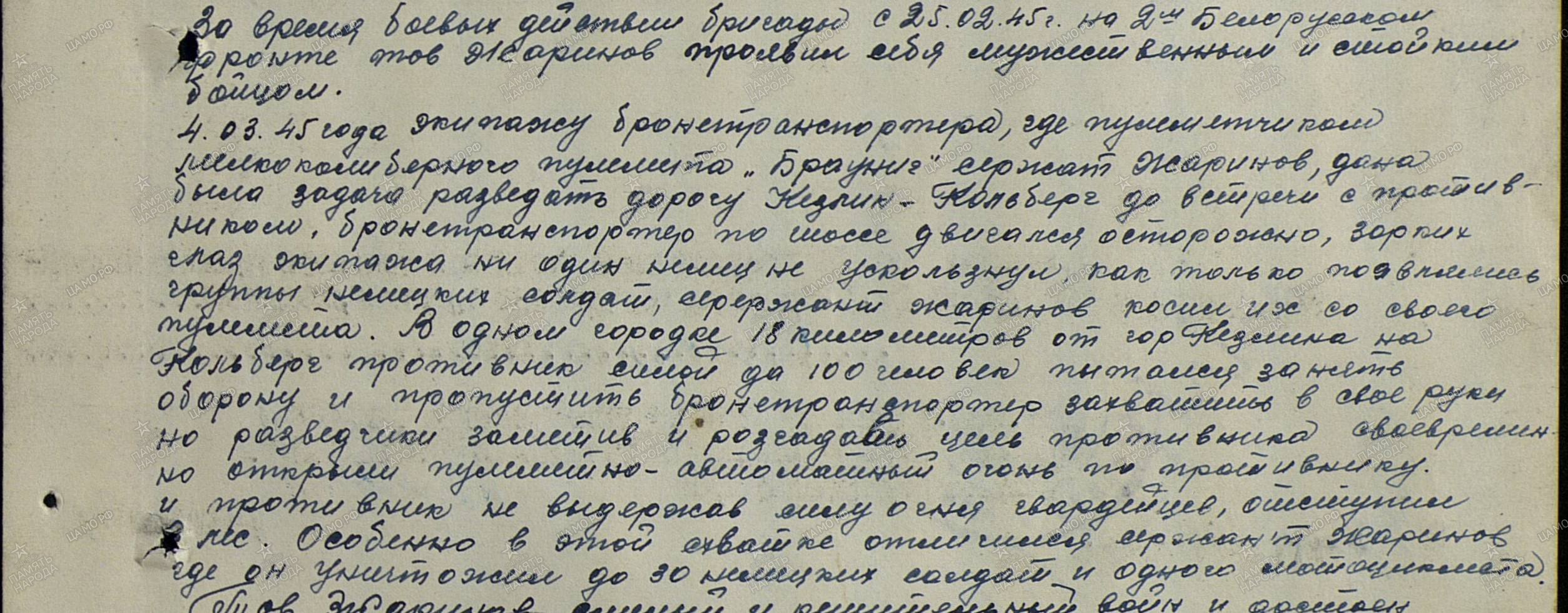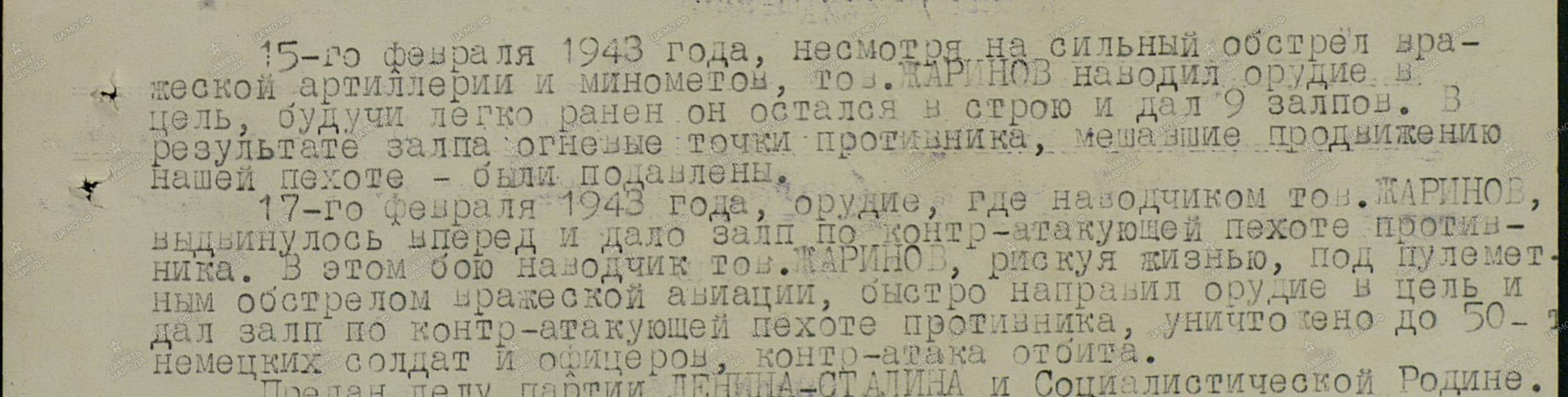 В марте 1945-го шли бои соединений II Белорусского фронта на Гданьском направлении. Предстояло ликвидировать крупную группировку неприятеля в Восточной Померании, очистить побережье Балтийского моря. Сотни снарядов выпустил сержант Жаринов в сторону врага. Такого мощного напора наших войск фашисты выдержать не смогли. Войска Советской Армии шли на штурм Берлина. Стрелок 362-го полка был не раз ранен, контужен, но возвращался в строй.
