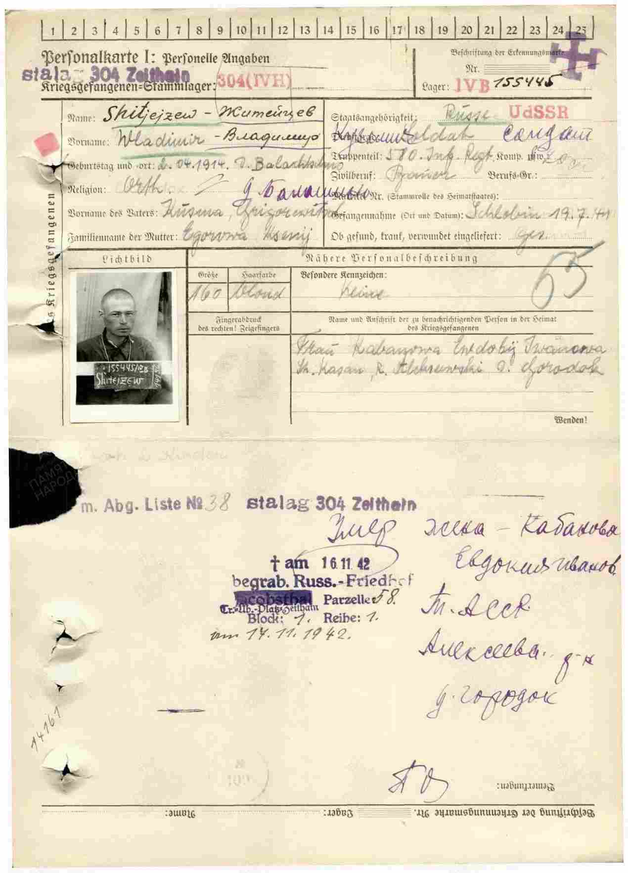 ЖИТЕЙЦЕВ Владимир Кузьмич, 1914, д. Городок/ с. Балахчино. Мобилизован 25 июня 1941 Алексеевским РВК. Красноармеец, 580 гаубично-арт. полк 154 СД 21 А Западного фронта. Попал в плен 19 июля 1941 у г. Жлобин, Гомельская обл., БелССР. Содержался в лагере военнопленных № 304 (IV H), м. Цайтхайн, р-н Майсен, г. Дрезден, земля Саксония, Германия. Умер 16 нояб. 1942.