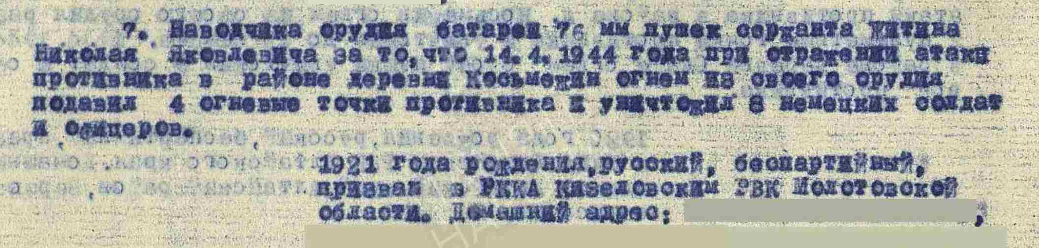 ЖИТИН Николай Яковлевич, 1921, с. Богоявленская (Красная) Горка. Призван Кизеловским РВК Молотовской обл. (Пермский край). Краснофлотец/ красноармеец/ сержант. Служил на Тихоокеанском флоте в береговой артиллерии, 77 отд. арт. дивизион Сучанского сектора береговой обороны Главной базы ТОФ/ бригада топедных катеров береговой обороны. В 1942 направлен на Сталинградский фронт, 685 СП 193 СД 62 А. Перенёс ранение. Ошибочно учтён погибшим 24 сент. 1942 в г. Сталинград, впоследствии увековечен на Мамаевом кургане. В 1944 – наводчик батареи 76 мм орудий 838 СП 237 СД в составе 40 А/ 38 А/ 1 гв. А/ 18 А 1 и 4 Украинского фронта. Участник освобождения Украины и Чехословакии. После войны жил в п. Урицк, Кустанайская обл., КазахССР. Награждён медалью «За отвагу», орденом Отечественной войны 2 ст. (1985).