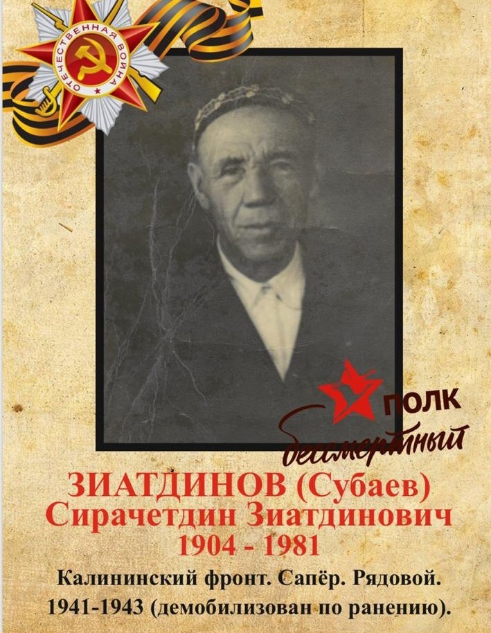 ЗИАТДИНОВ (СУБАЕВ) СИРАЧЕТДИН ЗИАТДИНОВИЧ Район: ДрожжановскийФронтовики Опубликовано 28 апреля, 2020 - 11:24 пользователем Радиф Субаев