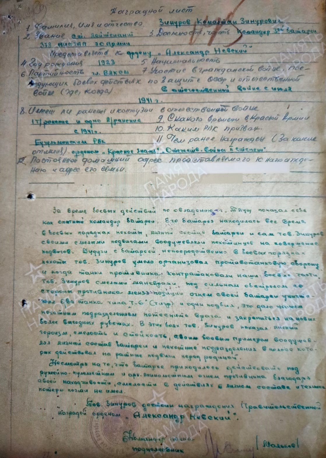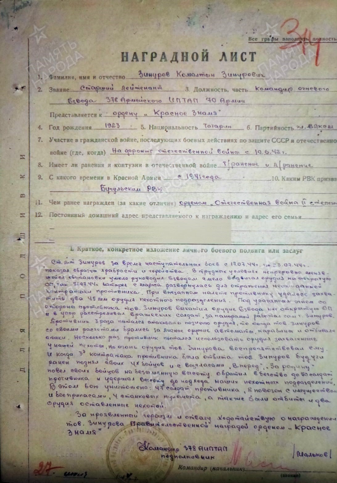 О том, как героически сражался Камалтин Зиннурович говорят документы – «Наградные листы».