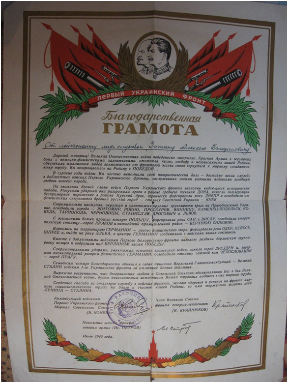 • Благодарственная грамота от командующего войсками Первого Украинского Фронта Маршала Советского Союза И. Конева. Июль 1945г.