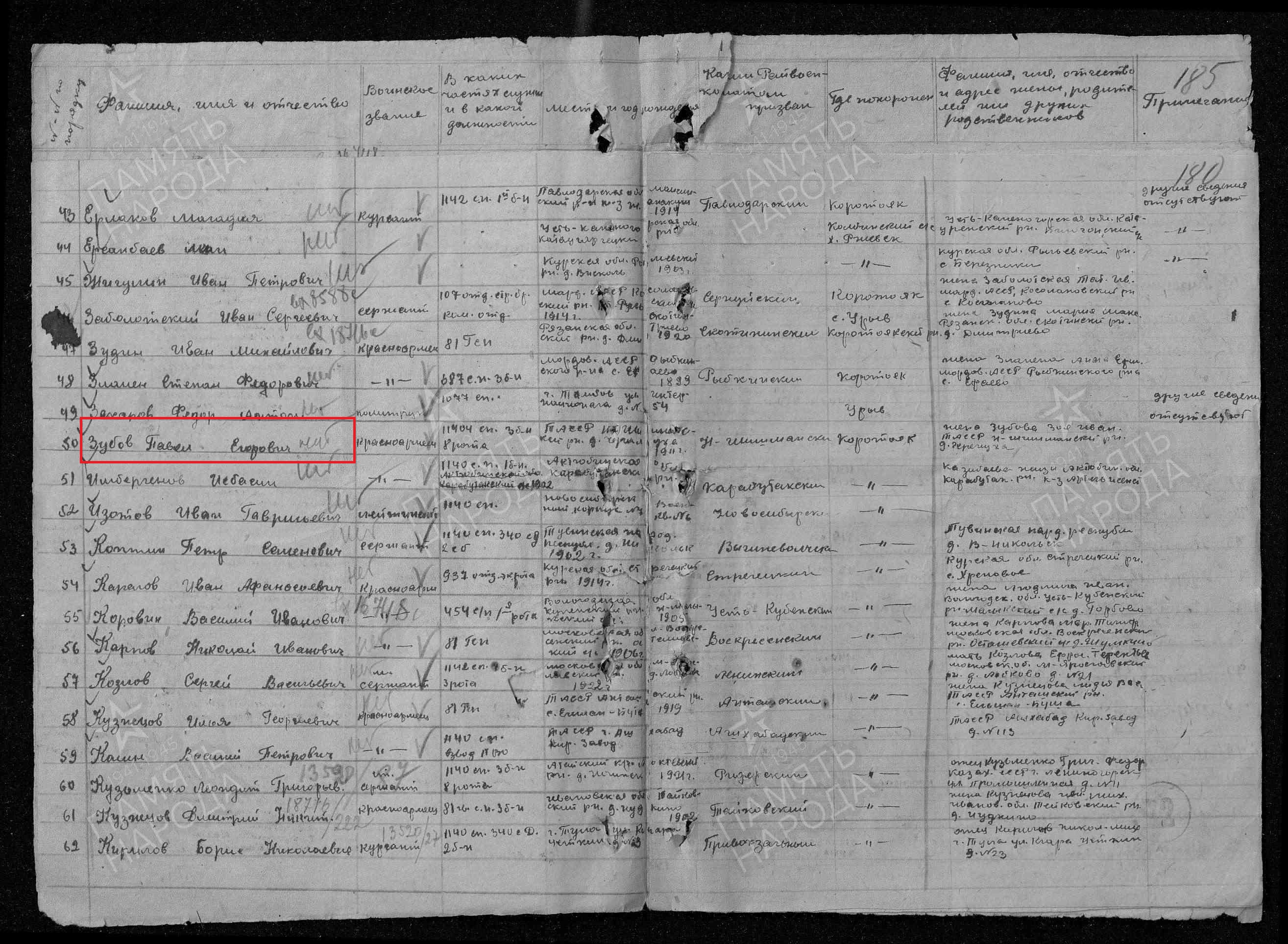 ЗУБОВ ПАВЕЛ ЕГОРОВИЧ родился в 1911 году в с.Сл.Черемуховая Казанской губернии Чистопольского уезда Новошешминской волости (ныне с.Слобода Черемуховая Новошешминского района РТ). Мобилизован Новошешминским РВК,кр-ц,1140 сп,340 сд. Причина смерти: погиб 14.01.43.г. Место захоронения: Воронежская обл., Репьевский р-н, х.Ржевский.