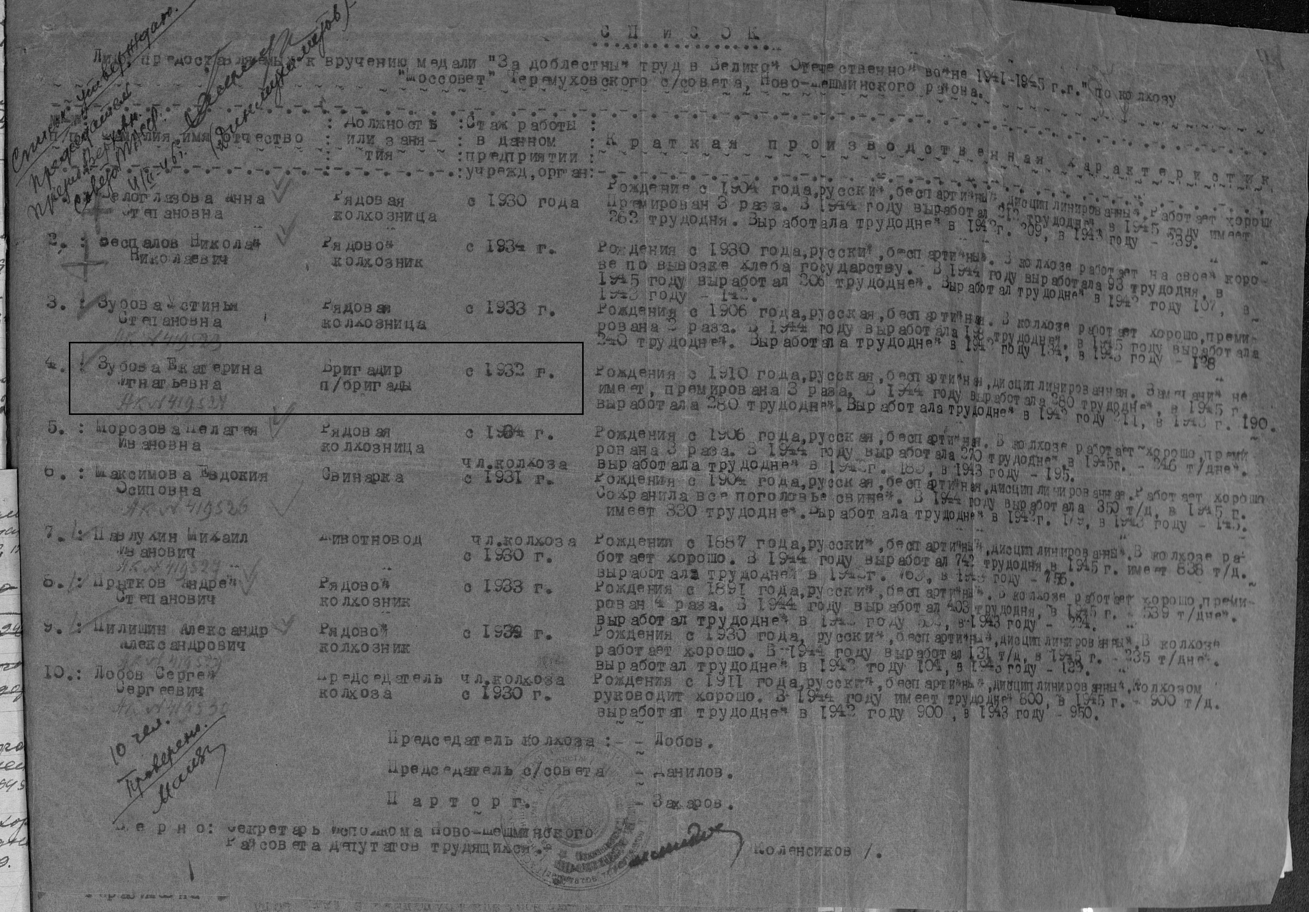 Зубова Екатерина Игнатьевна родилась в 1910 году в с.Сл Черемуховая Казанской губернии Чистопольского уезда Новошешминской волости. В годы Великой Отечественной войны работала в колхозе "Моссовет", бригадиром пол. Бригады. Награждена медалью "За доблестный труд в Великой Отечественной войне 1941–1945 гг." (акт от 28 апреля 1947., фонд 3610, опись 2, дело № 324, лист 55). Умерла в 1987 году, похоронена на сельском кладбище с. Сл. Черемуховая.