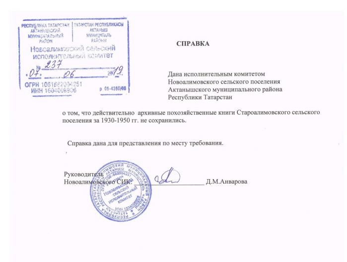 [19.06.2019 07:22] Алексей Крутько: Из того что предпринял по поиску родственников - по сути ничего. Я решил сперва узнать сохранились ли похозяйственные книги по Старо-Алимовскому с/с за 1930-1940-е гг, в надежде что в них будет сам боец и вопрос с отчеством отпадет. Но такие книги видимо не сохранились - я написа запрос в районный архив, они перенаправили в сельсовет - вообщем ничего нет.
