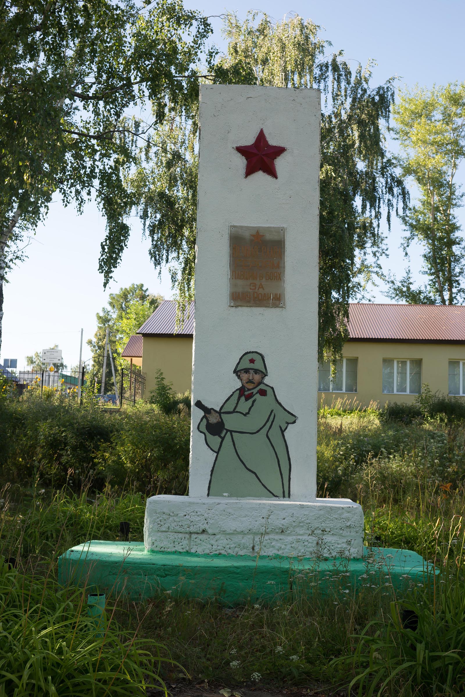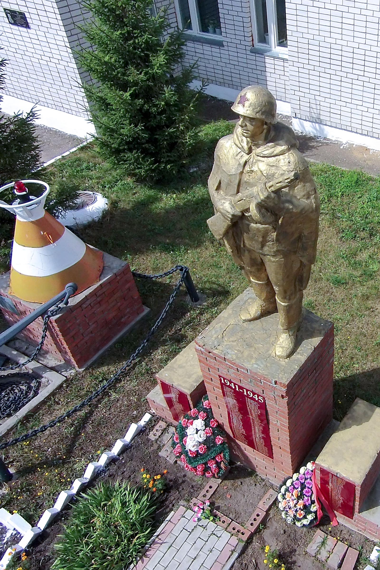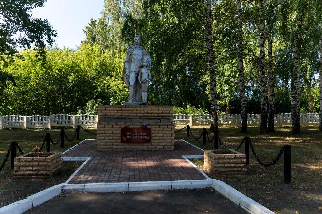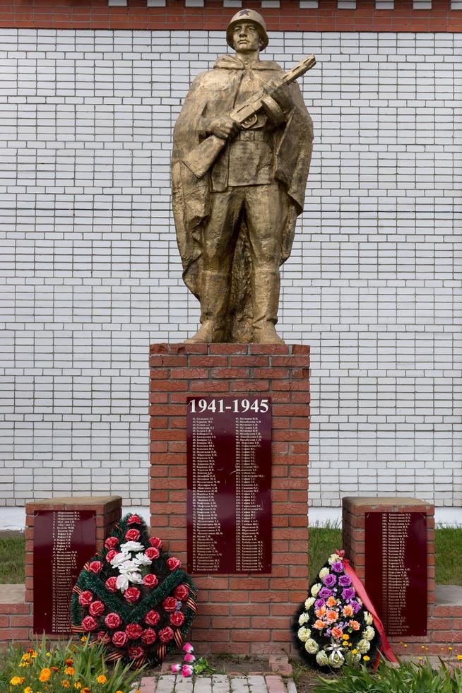На постаменте из кирпича изображен воин освободитель. Рядом установлены памятные доски с фамилиями погибших сельчан Дата установки 2005 г.