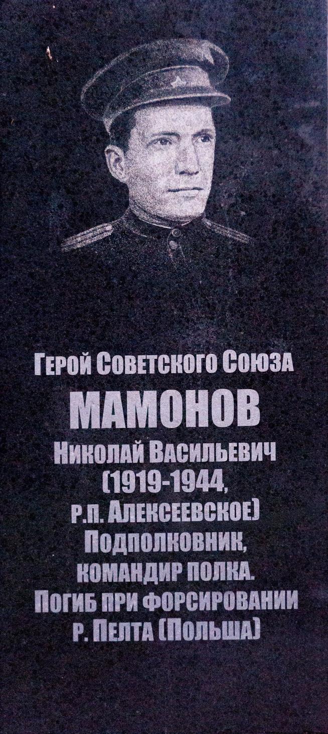 Фото №9745. Мемориальная доска Мамонову Н.В. (1919-1944) - Герою Советского Союза в Мемориальном комплексе. п.г.т.Алексеевское. 2014