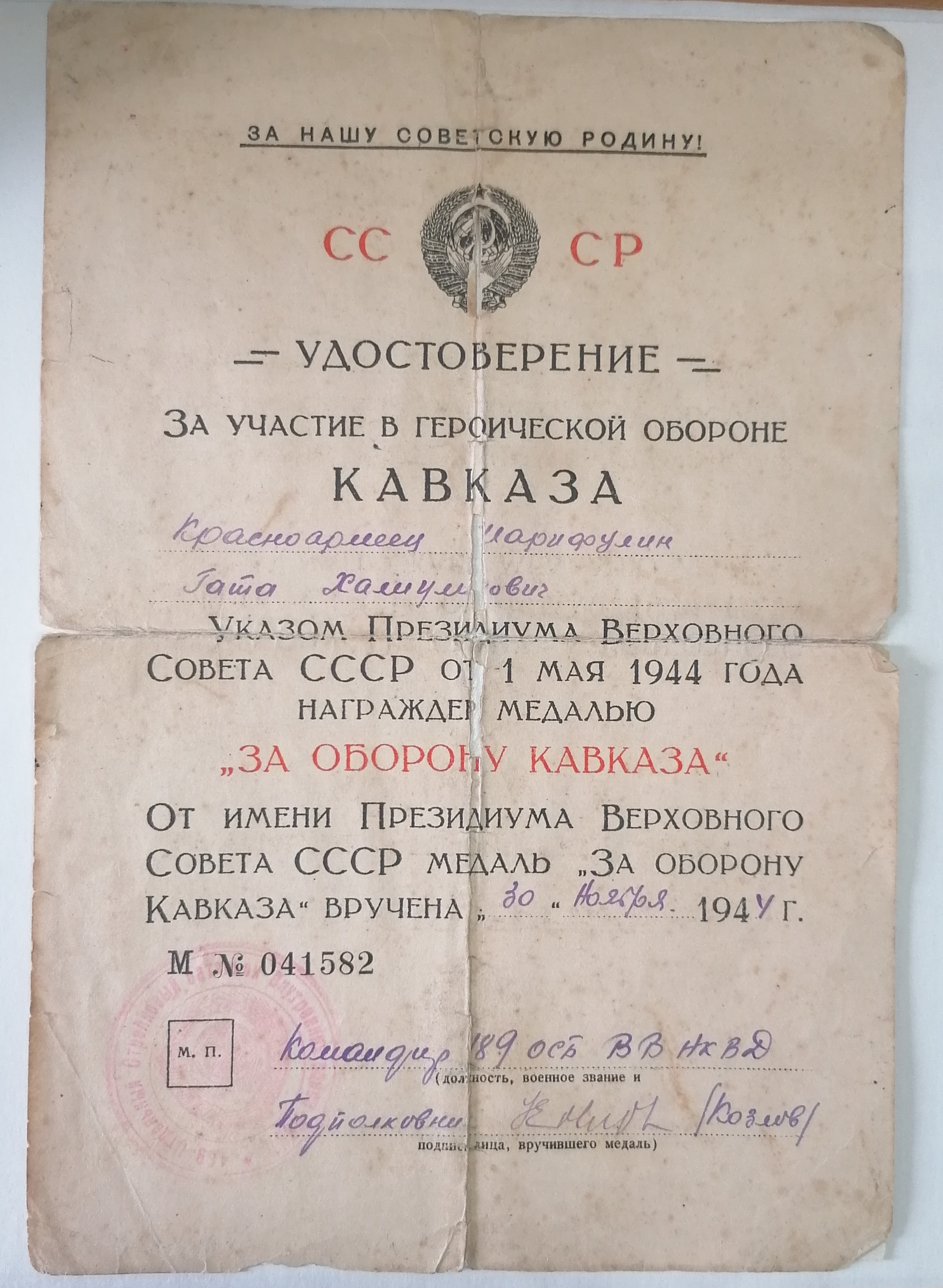 Кавказ өчен сугыш 1943 елның 9 октябрендә Тамань ярымутравын азат итү белән тәмамлана. Әлеге авыр сугышта катнашкан 850 000 нән артык кеше 1944 елда «Кавказны саклаган өчен» медале белән бүләкләнә.Шулар арасында,авылдашыбыз, Беренчемай районының (хәзерге Әлмәт районы) Түбән Абдул авылында туып үскән кызылармеец Шәрифуллин Мингата Хәлиулла улы да була. Аларның батырлыгы һәм чыдамлыгы, Ватанга булган мәхәббәте бу авыр сугышта нык калырга ярдәм итә, ә батырлыклары мәңгелек булып калды.