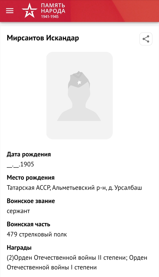 Мирсәитов Искәндәр Мирсәит улы сугышка 1942 нче елның 13 нче гыйнварында китә. Сугышта ул 479 нчы укчылар полкында хезмәт итә, сержант була. Бик күп батырлыклар эшли. Искәндәр Мирсәит улы күрсәткән батырлыклары өчен II нче дәрәҗә Ватан сугышы ордены (2) белән бүләкләнә, I нче дәрәҗә Ватан сугышы орденына лаек була. 1943 нче елны бик каты яралана. Кыр госпиталендә тездән аста аягын кисәләр. Кызганычка каршы, аягында гангрена башлана, аякны тездән өстә кисәргә туры килә. Туган авылына кайткач, Искәндәр яшелчәлек бакчасында бригадир хезмәтен башкара. 1965 нче елга чаклы колхоз бакчасында хезмәт куя. Тормыш иптәше Хәдичә белән 7 бала үстерәләр. 2001 нче елның 23 нче июлендә вафат була.