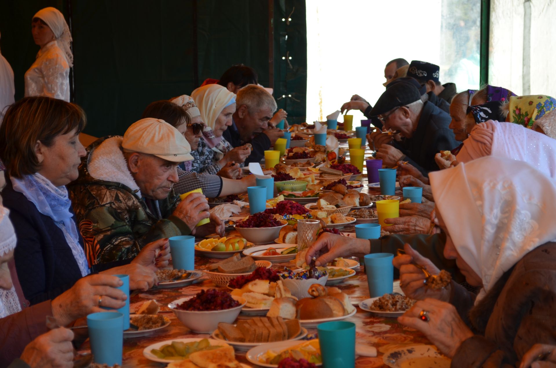 Өлкәннәр күңелле тамашалардан соң, мул сыйлы өстәлләр артында урын алды. Алар яшьлек хатирәләрен бүлешә-бүлешә сыйланды. Аннан барысы да канәгать һәм рәхмәтле булып, автобусларга утырып өйләренә юл алды.