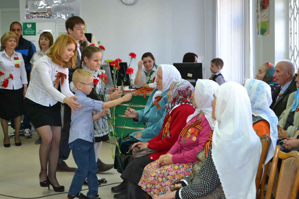 Кунакчыл банк хезмәткәрләре өлкәннәрне ишек төбендә үк каршы алды, бәйрәм белән тәбрикләде, һәрберсенә чәчәкләр бүләк итте. Балалар сугыш һәм тыл ветераннары өчен шигырьләр сөйләде.
