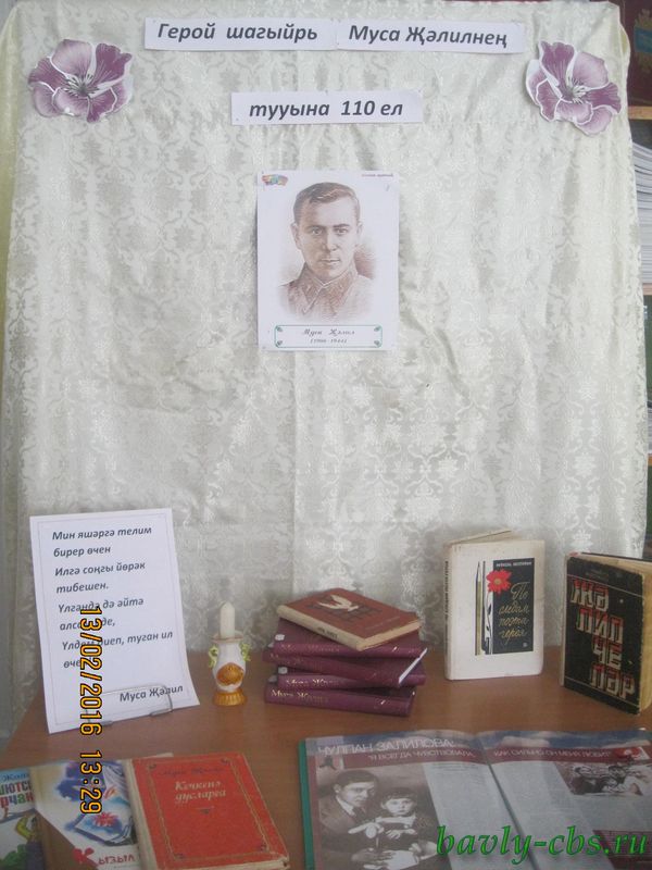 Китапханәдә М.Җәлилнең китапларыннан торган күргәзмә ясалды. Китапханә мөдире Ахметзянова Э.Х. укучыларны язучының биографиясе, иҗаты, тормыш юлы белән таныштырды, Мусаның кечкенәдән тәвәкәл, җитди, тормыш яратучан холкын укучыларга үрнәк итеп куйды.Укучылар китапханәдә булган альбомнар, китаплар белән таныштылар,батыр йөрәкле язучының әсирлектә чакта язылган шигырьләрен кычкырып укыдылар.Чарада 5 укучы, сыйныф җитәкчесе Әминә Нурмөхәммәтовна катнашты.8 китап бирелде.