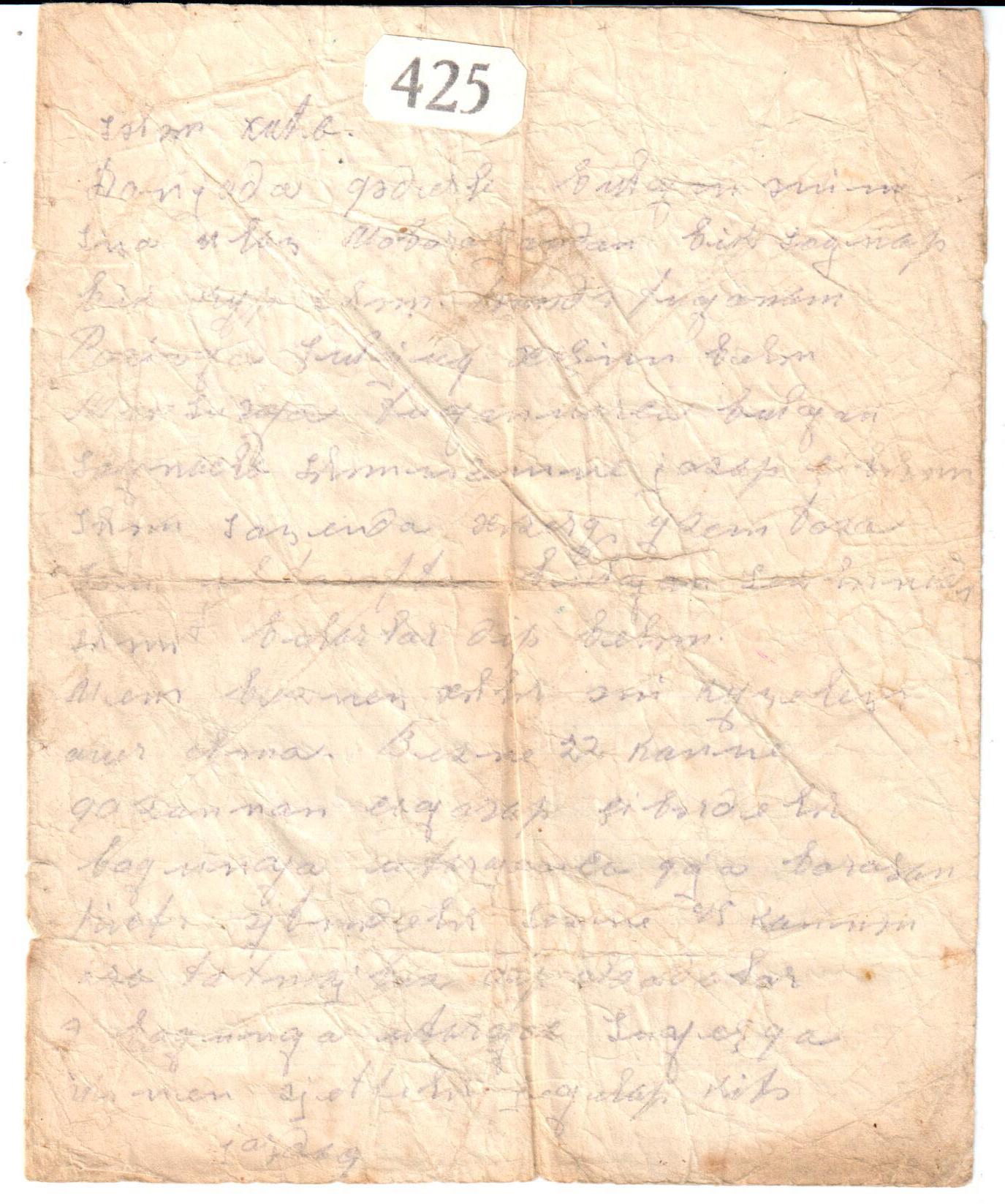 Дөньда кадерле булган әнием. Сиңа улың Мөбәрәкҗаннан бик сагынып бик күп сәлам. Һәм туганнарым Разия, шулай ук Һашим белән Мансурга, туганнарга булган сагынычлы саләмнәремне язып җибәрәм. Сәлам соңында хәзергә үзем таза-сау. Ул тарафта булган сезләрне дә сәламәт булырлар дип беләм. Әни, күңелеңә авыр алма, безне 22 се көнне (22.06.41)Казаннан чыгарып җибәрделәр. Вагонга утырганда кая барасын һич тә әйтмәделәр, сезне 45 көннән ары тормыйбыз дип ышандырдылар (алдадылар). Ә вагонга утыргач сугышка икәнен әйттеләр. Егылып китә яздык. Бу хатны вагонда язып бардым. Кайда туктасы мәгълум түгел әле. Ярый, әни һәм туганнар, минем өчен артык кайгырмагыз, без күрәсен кеше күрмәс. Туфрак аннан алынган булса, бәлки кайтып күрешербез. Алланың рәхмәте күп. Әни,син бигрәк тә минем өчен кайгыртып үзеңне-үзең бетермә. Ләкин догаңнан ташлама, исәнлектә күрешүне телә. Озакка сузылса, белмим инде нәрсә булыр. Аннан соң налог салсалар түләмәгез, булырга тиеш түгел. Икмәк якларыгыз юктыр инде, бер төрле дә хәбәрләшә алмадык. Инде урманнан киткәч 45 көн тулды, бирмәсләр дип бармыйча калмагыз. Договор срогы тулганчы бирергә тиешләр. Ярый хатка язып сүз бетмәс, исәнлектә күрешергә язсын.