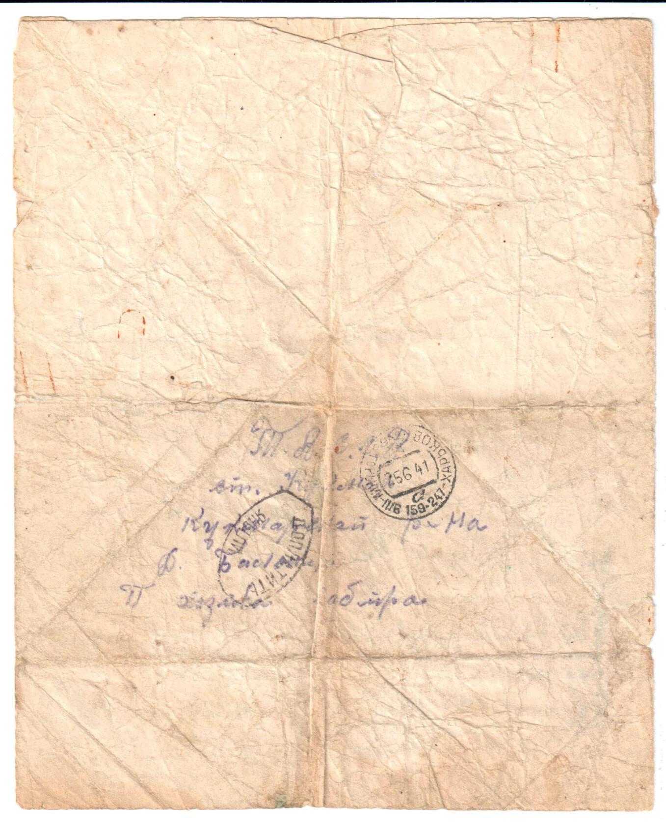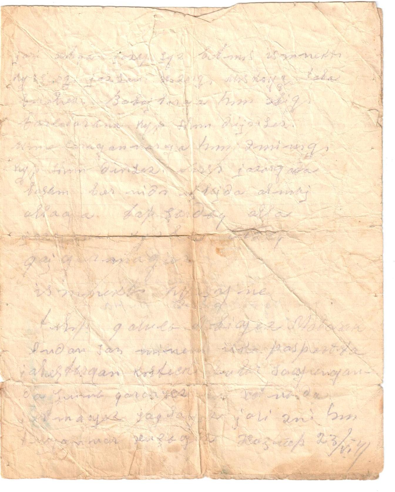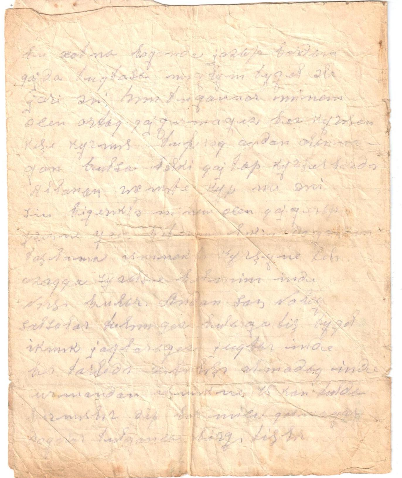 Хәзергә Мәскәүгә таба барабыз. Бабайларга һәм әбигә дә барчаларынакүп сәлам диярсез. Мине сораганнарга һәи Әминәгә дә күп сәлам диярсең. Нәрсә язарга башым берни дә уйлый алмый. Аллаг тапшырдык. Артык кайгырмагыз, исәнлектә күрешуләрне теләп калучы Мөбәрәк. Аннан соң минем иске паспортта ябыштырган карточка булыр, сагынганда карарсыз. Бу хатымны да ертмагыз, саклагыз. Ярый, әни һәм туганнар, хушыгыз. Мөбәрәкҗан. 23/VI-1941 ел.