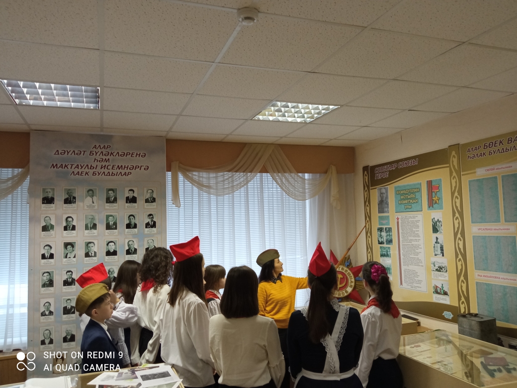 Татар әдәбияты дәресе вакытында да Муса Җәлил иҗаты белән танышу дәвам итте. Укучылар герой-шагыйрьгә багышланган видеофильм карадылар, сыйныф бүлмәсендә оештырылган күргәзмәдәге китапларга күзәтү ясадылар.