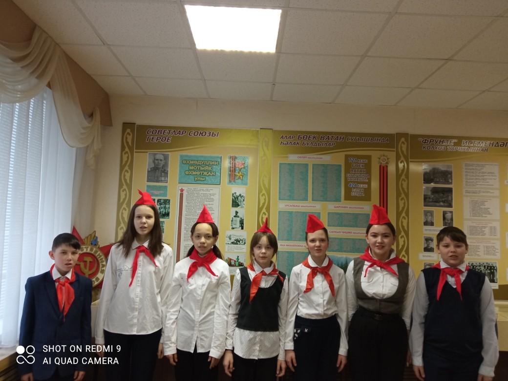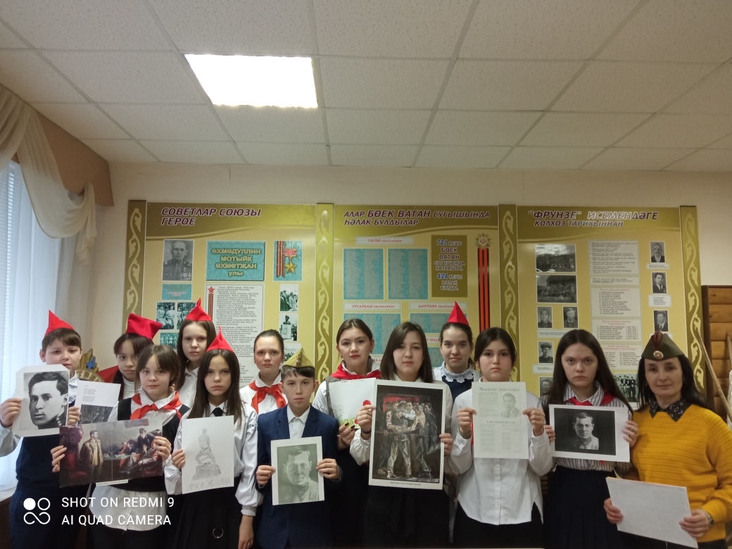 Батырлык сәгатенең икенче өлешендә авылдашыбыз Советлар Союзы Герое Мотыйк Әхмадуллинга һәм Бөек Ватан сугышында катнашкан авылдашларыбызга багышланган стендтагы материаллар белән таныштылар, белгәннәрен яңарттылыр.