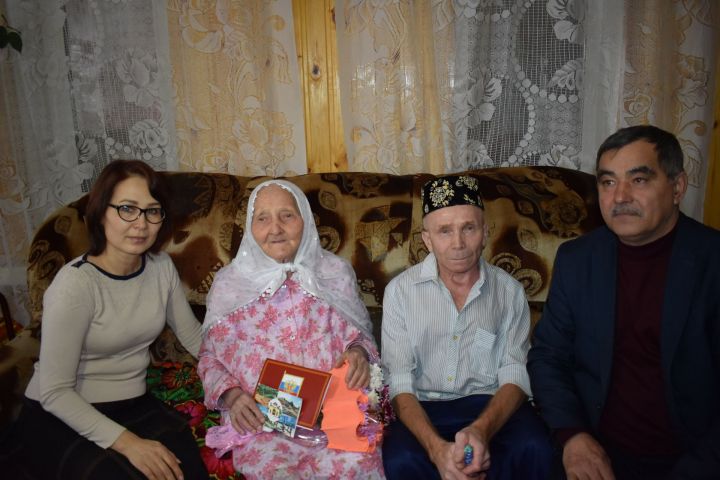 90 яшьлек олы юбилее уңаеннан Разыя әби Гыймадиевага Ил башлыгының Котлау хаты, район башлыгының Котлау открыткасы, бүләк һәм чәчәк бәйләме тапшырылды.