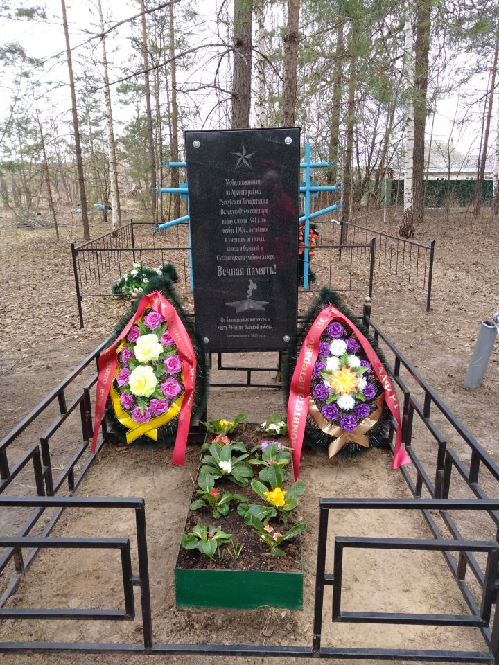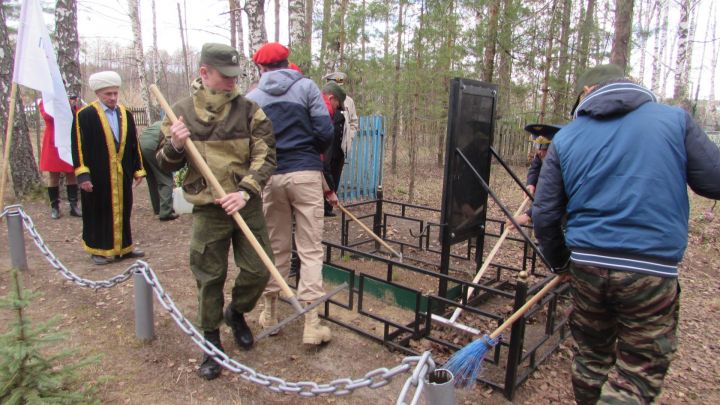 Елдагыча хәрби комиссариат яныннан кузгалып китеп, зур трассага чыгып, Йошкар-Ола трассасы белән бардык каберлеккә. Үзебез 2015 нче елда зиратка куйган мемориаль такталы чардуган эчен җыештырып, туган җир туфрагын салып, чәчәкләр утырттык. Хәлил хәзрәт белән Лин атакай биредә шәһит киткән солдатларның рухларына дога укып багышлаганнан соң, барыбыз да бер минут тын тордык.