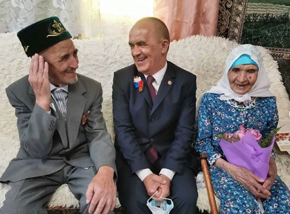 Түке авылында гомер кичерүче ветеран гаилә - тыл ветераны Мәлүфә апа һәм сугыш каһарманы Миңнегали Галиевлар Актаныш район башлыгы Энгель Фәттахов белән. Корпункт: Актанышский Опубликовано 7 May, 2020 - 19:46 пользователем Актанышский музей