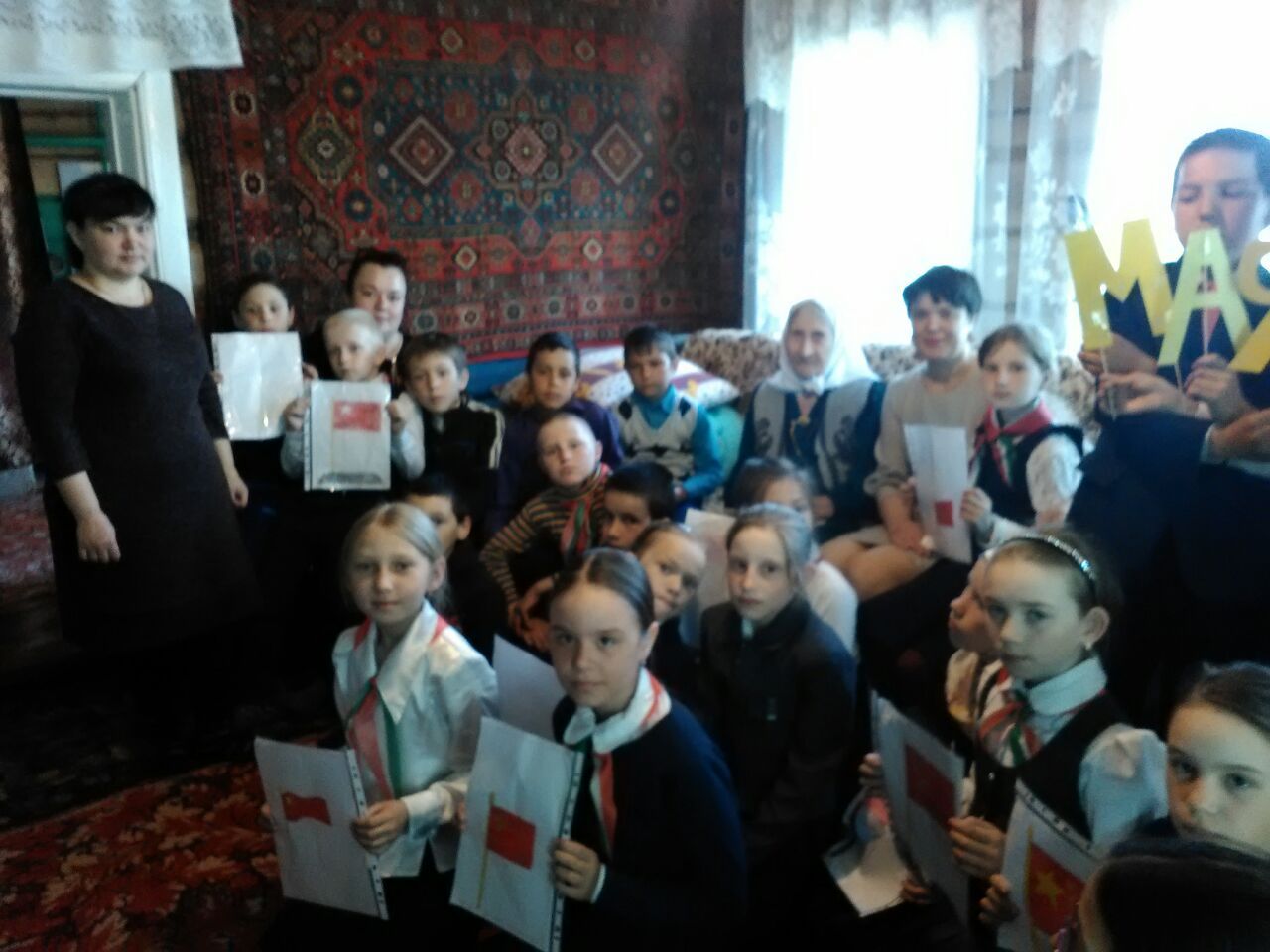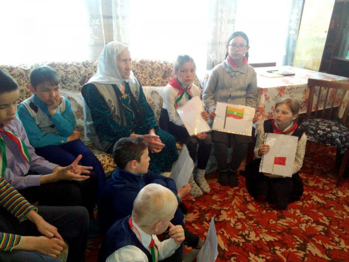 Апас районы Зур Күккүз авылы китапханәсе башлангыч сыйныф укучылары белән берлектә тыл ветераны Шайхеддинова Наҗия Шигаповна йортында "Җиңү байрагы" дип исемләнгән тематик кичә үткәрде.