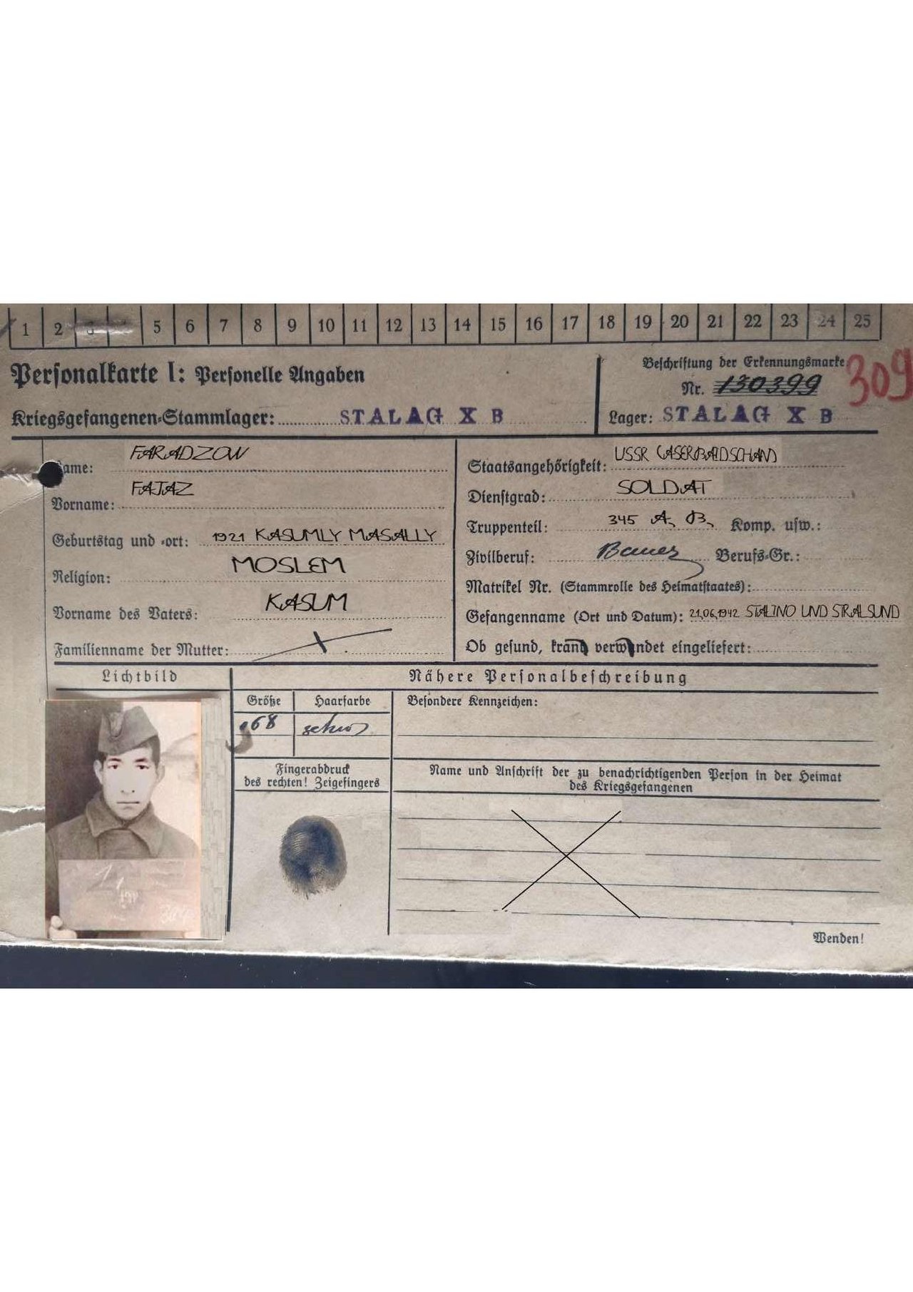 Фәрәҗов Фаяз Гасым улы 1921 елда, Азәрбайҗан ССР-ы, Ленкоран өязенең Гасымлы авылында туган. 1941 елда Масаллы районы хәрби комиссариаты тарафыннан Совет Армиясе сафына чакырыла. Ростов өлкәсенең Прохладный шәһәрендә урнашкан хәрби часта хезмәт итә башлый. 1941 елда Кырымны азат итүдә катнаша. 1942 елда Харьков янында Изюм шәһәре өчен алышларда башы каты яраланып, әсирлеккә эләгә. Әсирлектә Сталино һәм Штранс шәһәрләрендәге лагерларда була. Аларда 4-5 ай тотылганнан соң Италиягә озатыла. 1944 елның 14 ноябрендә СССР Хөкүмәтенең 10нчы карарына ярашлы, Инглиз командованиесе тарафыннан илгә кайтарыла һәм 21 ноябрдә Ерак Көнчыгышка эшкә җибәрелә. Анда 1947 елның апреленә кадәр эшли. Туган авылына кайткач, Коръән дәресләре бирә, Ислам турында белемнәрен тарата.Аның өч теле бар: төрки, рус һәм гарәп.СССР Югары Советы Президиумының 27.01.1958 елгы «яраланган яки әсирлектән качкан элеккеге хәрби әсирләрне СССР орденнары һәм медальләре белән бүләкләү турында» гы Указын үтәү өчен, немец-фашист басып алучылары белән сугышларда яки Бөек Ватан сугышы чорында әсирлектән качканда күрсәткән батырлыгы өчен Фаяз Фараҗев медаль белән бүләкләнде «Бөек Ватан сугышында Германияне җиңгән өчен» һәм «Бөек Ватан сугышында фидакарь хезмәт өчен»медале. 1975 елның 7 маенда «Бөек Ватан сугышында Җиңүнең утыз еллыгы»юбилей медале белән бүләкләнә. 1978 елның 23 мартында «СССР Кораллы Көчләренә 60 ел»медале белән бүләкләнә. 1980 елның 30 ноябрендә «Хезмәт ветераны»медале белән бүләкләнә. Озак авырудан соң 1998 елның 19 маенда Азәрбайҗан Республикасы, Масаллы районы, Гасымлы авылында вафат була. Авыл зыяратында җирләнгән.