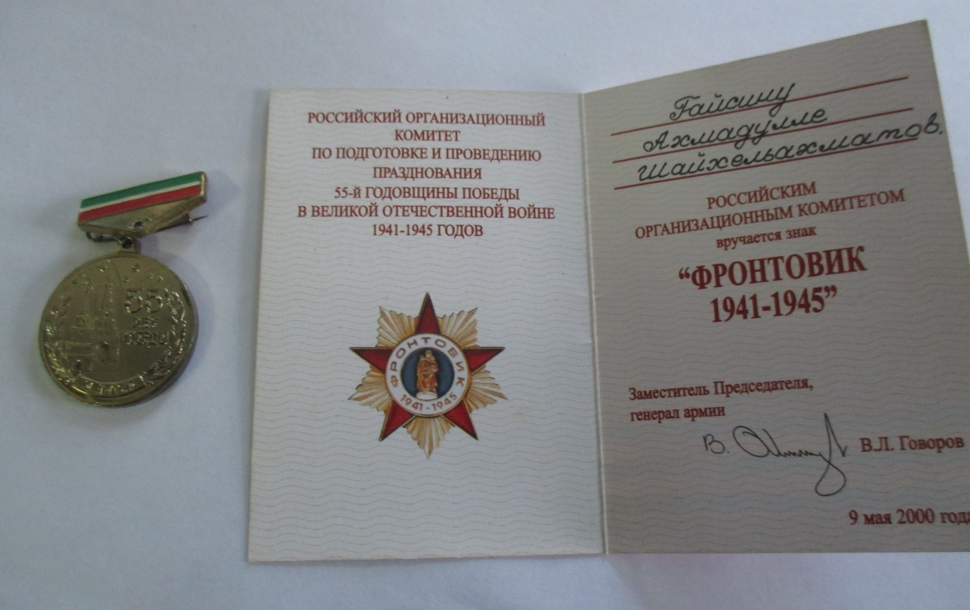 Сугышта катнашканым өчен күп санлы юбилей медальләренә, «Фронтовик» билгесенә, «Совет Армиясенә һәм хәрби диңгез флотына 95 ел» медальләренә лаек булдым.