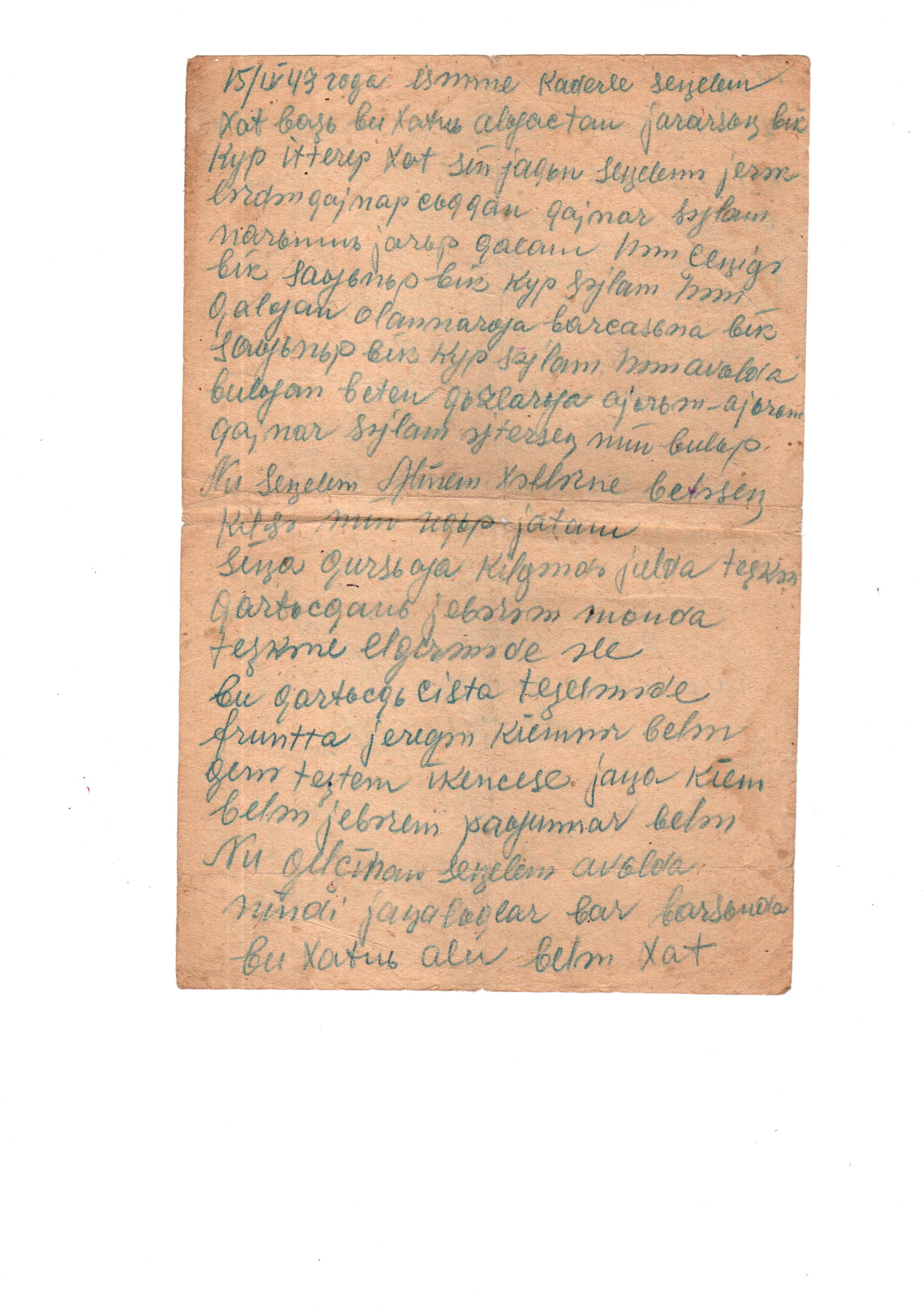 Сезки гыйззәтле булып торучы әти белән әнигә углыгыз Габдулладан бик сагынып күп сәлам һәм дә башка тугганнарга, тирә – күршеләргә, агай – энеләргә, һәрбарчасына аермаенча күп сәлам. Сәлам соңында, үзем әлегә исән –сау, Аллага шөкер. Сезне дә исәннәрдер дип беләм. Минем хәлгә килгәндә, әлегә исән – сау, алдагын белеп булмый________________ялгыз________минем хәлне беләсез. Үзегезнең хәлгә килгәндә, нишләп торасыз. Ашау яклары ничек? Мингали әбзи, Гариф әбзи өйдәме? Вагиз өйдәме? Авылда нинди хәлләр, нинди яңалыклар бар? Картлар сортыннан кемнәр китте? Сыер – сарык калдырдыгызмы? Әптәйләр, ____________ни хәлдә торалар?