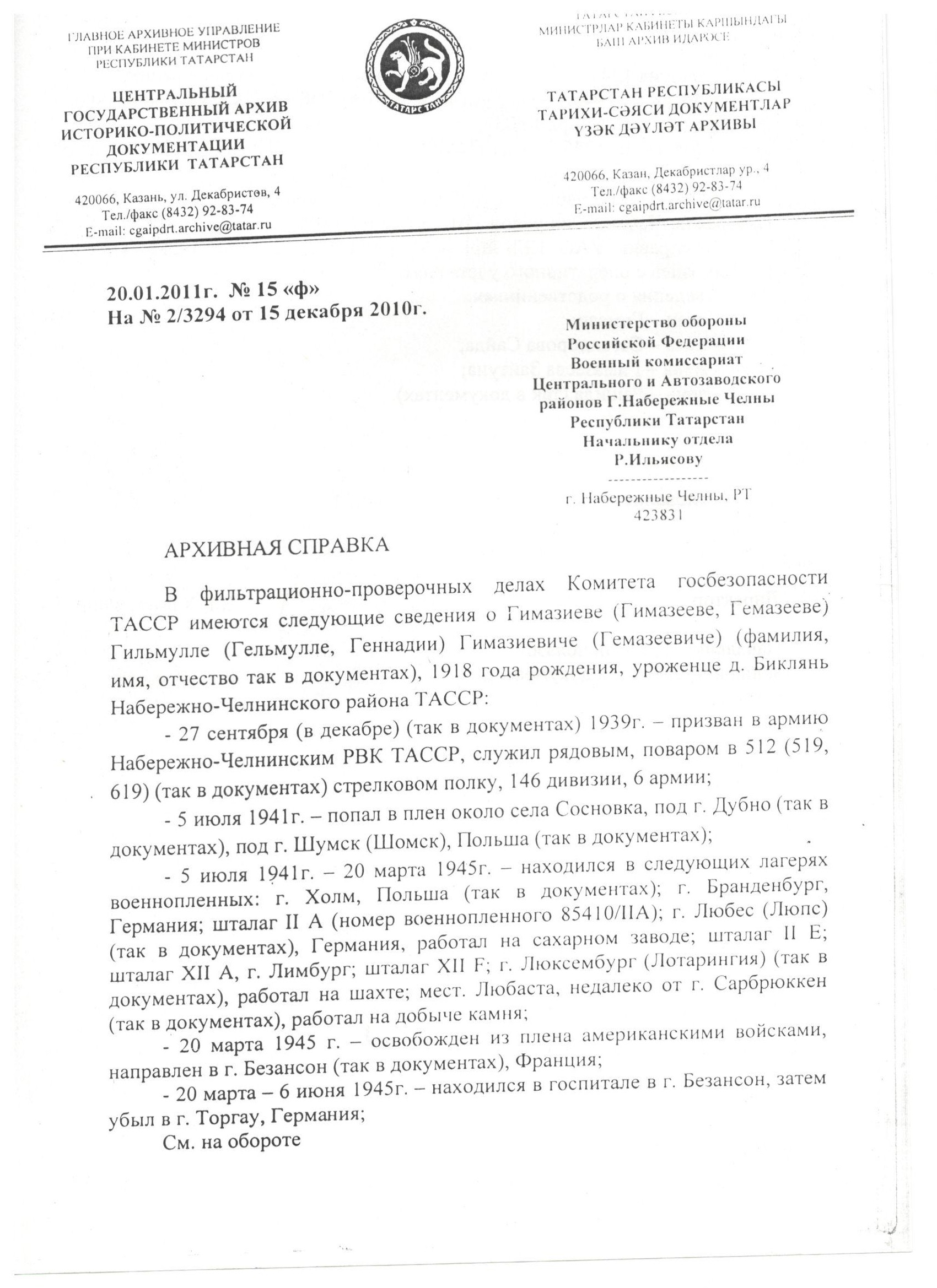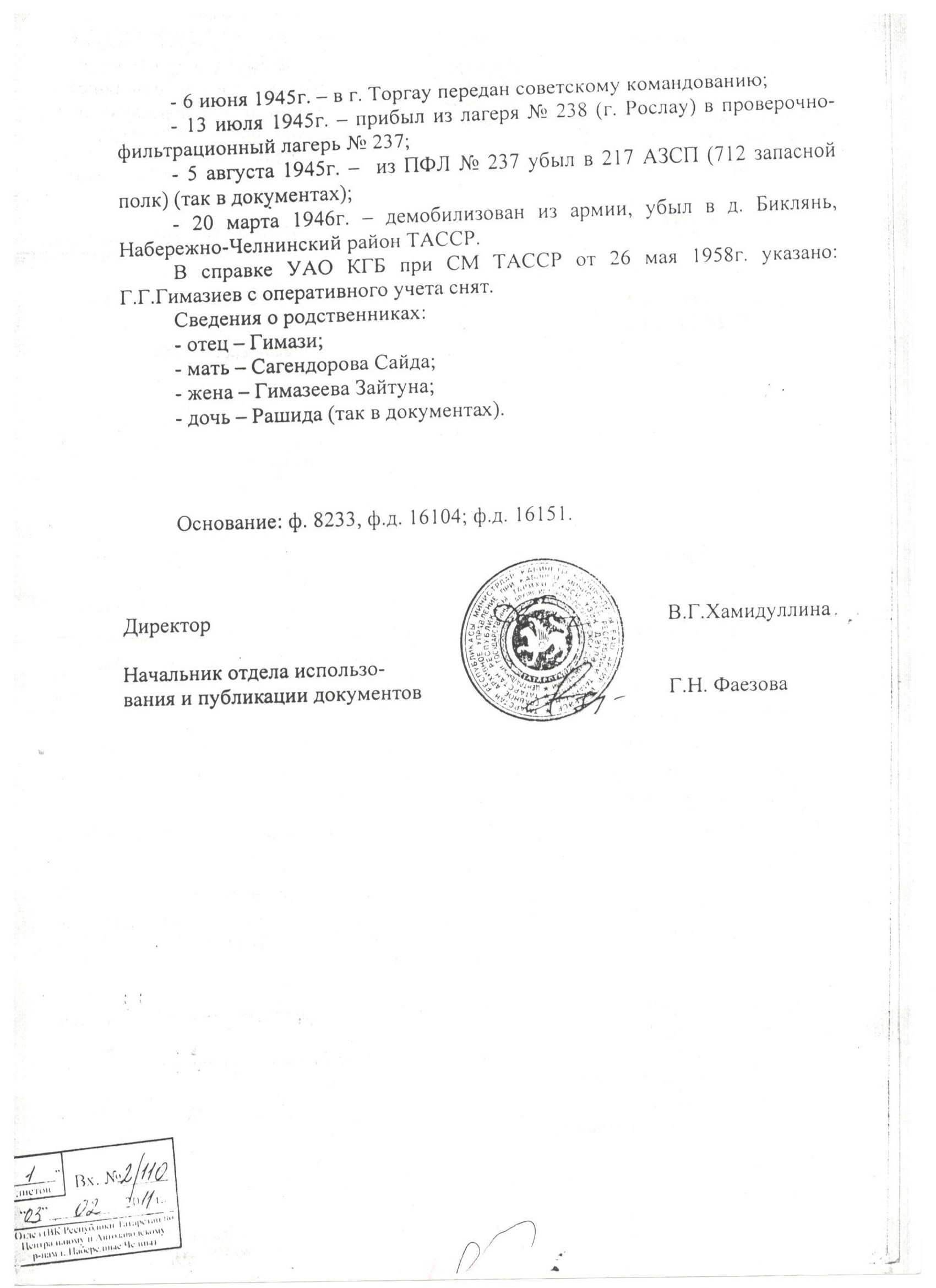В справке УАО КГБ при СМ ТАССР от26 мая 1958 г. указано Г.Г. Гимазиев с оперативного учета снят.