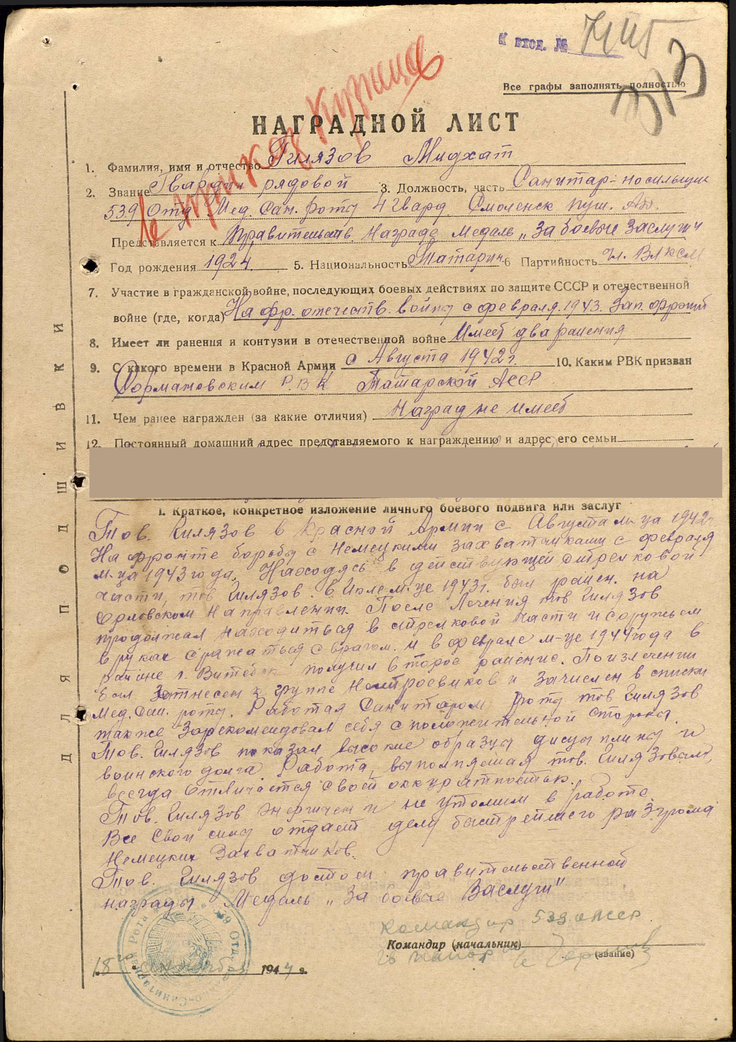 I дәрәҗә Бөек Ватан сугышы, Хезмәт Кызыл Байрагы орденнары һәм 3 сугышчан медаль белән бүләкләнә.