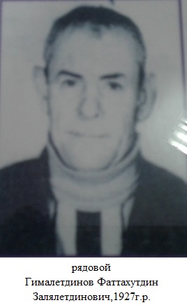 Гыймалетдинов Фәттахетдин Җәләлетдин улы 1927 елда ТАССРның Әлки районы Иске Салман авылында туа. Фронтовик. Бөек Ватан сугышы ветераны. 1944 елда ТАССРның Әлки район хәрби комиссариатыннан чакырыла.