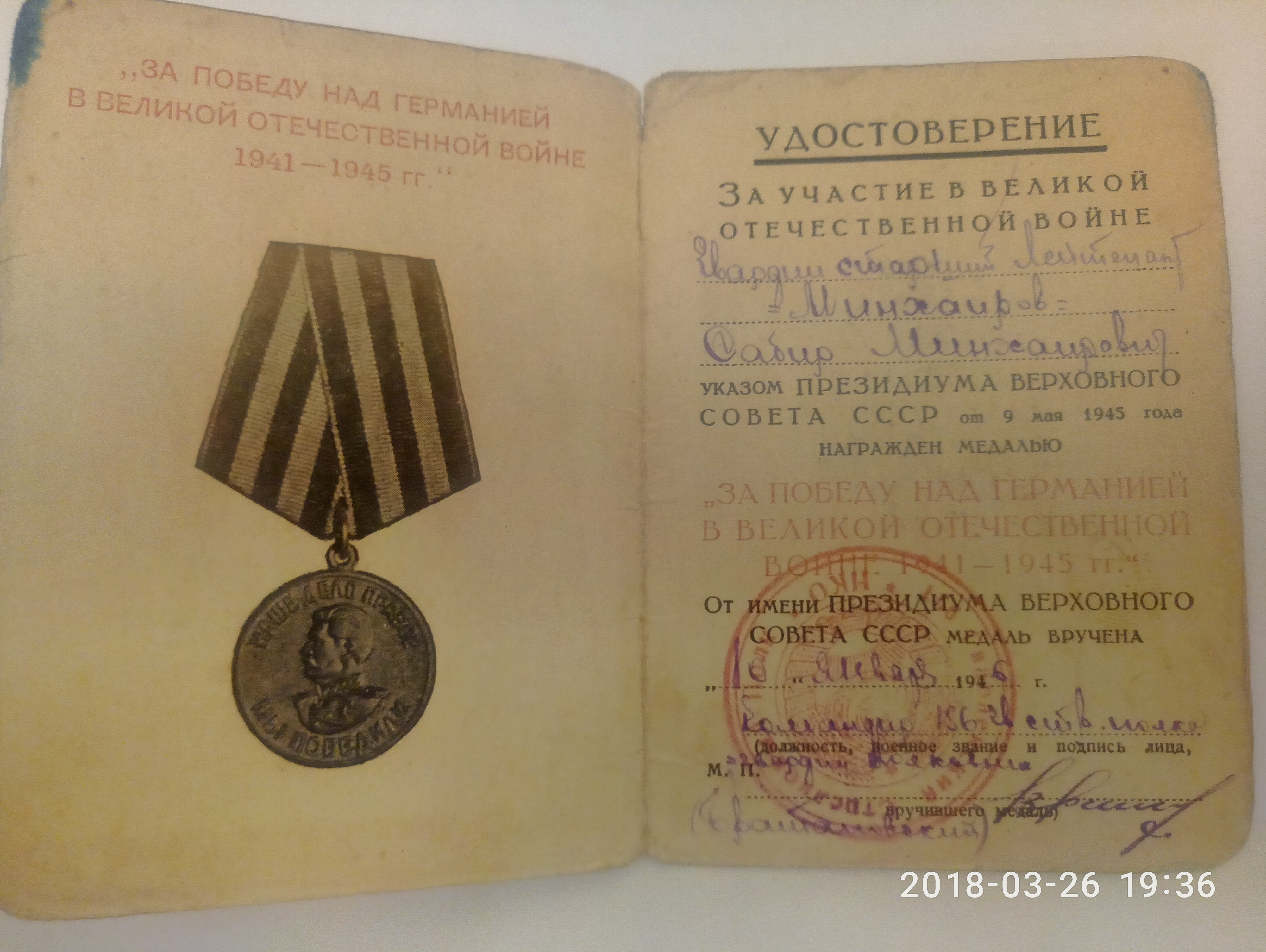Илебезне фашист илбасарларыннан азат итүдәге каһарманлыгы өчен Сабир Минхаеров 1945 нче елда – Кызыл Йолдыз ордены, 1946 елда – “Бөек Ватан сугышында Германияне җиңгән өчен”, 1967 елда “ Бөек Ватан сугышында күрсәткән батырлык өчен” медальләре белән бүләкләнә. 1944 - 1945 елларда Өченче Балтыйк буе фронты состафындагы танкка каршы истребитель полкында хезмәт итә. Эстония, Латвия, Литваны азат итүдә катнаша. Сабир Минхаер улы Бөек җиңүне гвардия өлкән лейтенанты, ягъни офицер дәрәҗәсендә Кенигсбергта каршы ала. Ул 1946 елның октябрь аенда күкрәкләре тулы орден –медальләрен туып – үскән Елховой авылына кайтып керә.