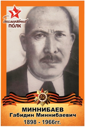 Миннебаев Габидин Миннебай улы-1899 елда Әлмәт районы Миңлебай авылында туган.1941 елда сугышка киткән, 1945 елда кайткан.1966 елда вафат булган.