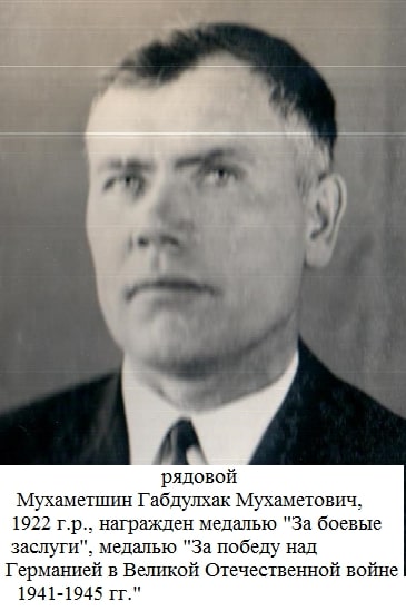 Мөхәммәтшин Габделхак Мөхәммәт улы 1922 елда Казан губернасының Спас өязе Карамалы авылында (хәзер ТР Әлки районы) туган. Бөек Ватан сугышы ветераны. 1942 елда фронтка алына. Новокузнецк шәһәрендәге Вильнюс пехота училищесына командирлар әзерләү курсларына укырга җибәрәләр. Өч айдан сержант Мухаметшин пулеметчик булып Калининск фронтына җибәрелә. 1943 елда Смоленск юнәлешенә 76-мм орудиягә наводчик итеп билгеләнә. 259 нчы гв. укчы полкының 65 дивизиясендә сержант булып хезмәт итә. 1943 елда авыр яраланып Дербент шәһәре госпиталенә җибәрелә. 1944 елның гыйнварында авылга кайта. 1944 елның февралендә Карамалы сигезьеллык мәктәбенә военрук булып эшкә урнаша.