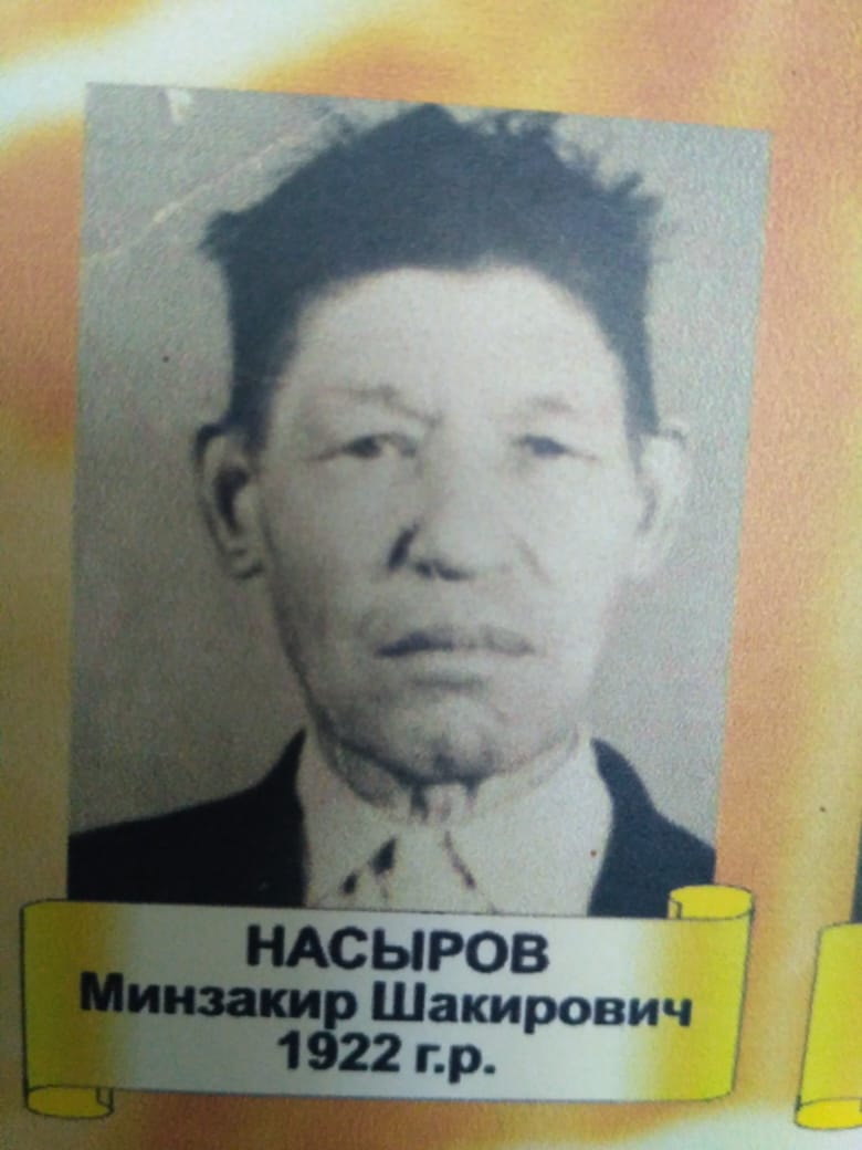 Нәсыров Минзакир Миншакир улы 1922 елда Казан губернасының Спас өязе (хәзер ТР Әлки районы) Татар Чиябашы авылында туа. 1941 елда фронтка алына һәм Ленинград фронтына җибәрелә. Харьков сугышында катнаша .1944 елда сәламәтлеге аркасында туган ягына кайта. Сержант. "Германияне җиңгән өчен" медале белән бүләкләнгән. 1996 елда вафат.
