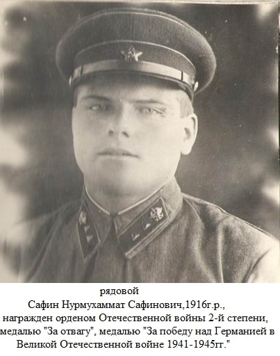 САФИН НУРМӨХӘММӘТ САФА улы 1916 елда Казан губернасының Спас өязе Иске Әнҗерә авылында (хәзер ТР Әлки районы) туган. Бөек Ватан сугышы ветераны. ТАССРның Әлки район хәрби комиссариатыннан чакырыла. 2006 елда вафат.