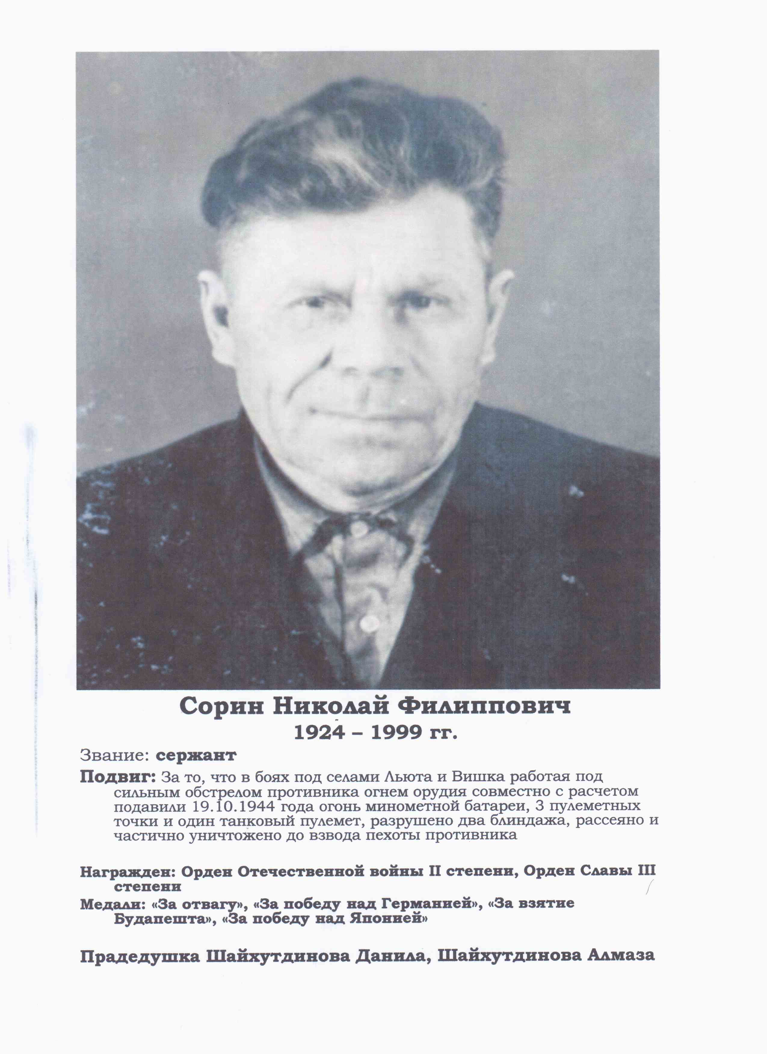Сорин Николай Филиппович 1924 елда Казан губернасының Спас өязе Базарлы Матак авылында (хәзер ТР Әлки районы) туган. Бөек Ватан сугышы ветераны. 1942 елда ТАССРның Әлки район хәрби комиссариатыннан алына. 1999 елда вафат.