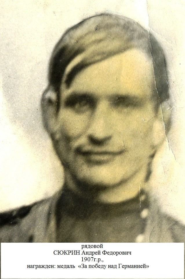 Сюкрин Андрей Федорович 1907 елда Казан губернасының Спас өязе Юхмачы авылында (хәзер ТР Әлки районы) туган. Бөек Ватан сугышы ветераны. 1941 елдан Кызыл Армиядә. Званиесе: рядовой. 11.12.1942 елда һәлак була.