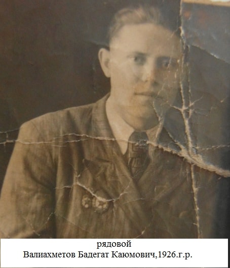 Вәлиәхмәтов Бәдегать Каюм юлы 1926 елда Казан губернасының Спас өязе Бибай Чаллысы авылында (хәзер ТР Әлки районы) туган. Бөек Ватан сугышы ветераны. 1943 елда ТАССРның Әлки район хәрби комиссариатыннан алына.